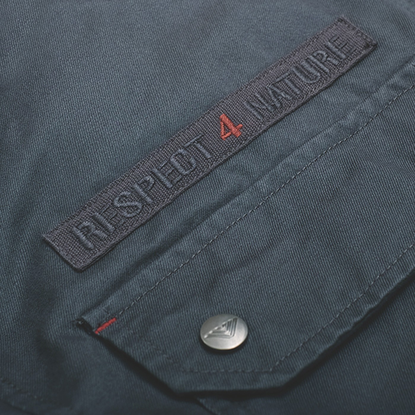 Z dizajnových prvkov vyniká na prednom diele nášivka s nápisom RESPECT 4 NATURE, a tiež malé kontrastné švy pri zatváraní vreciek na prednom diele bundy.