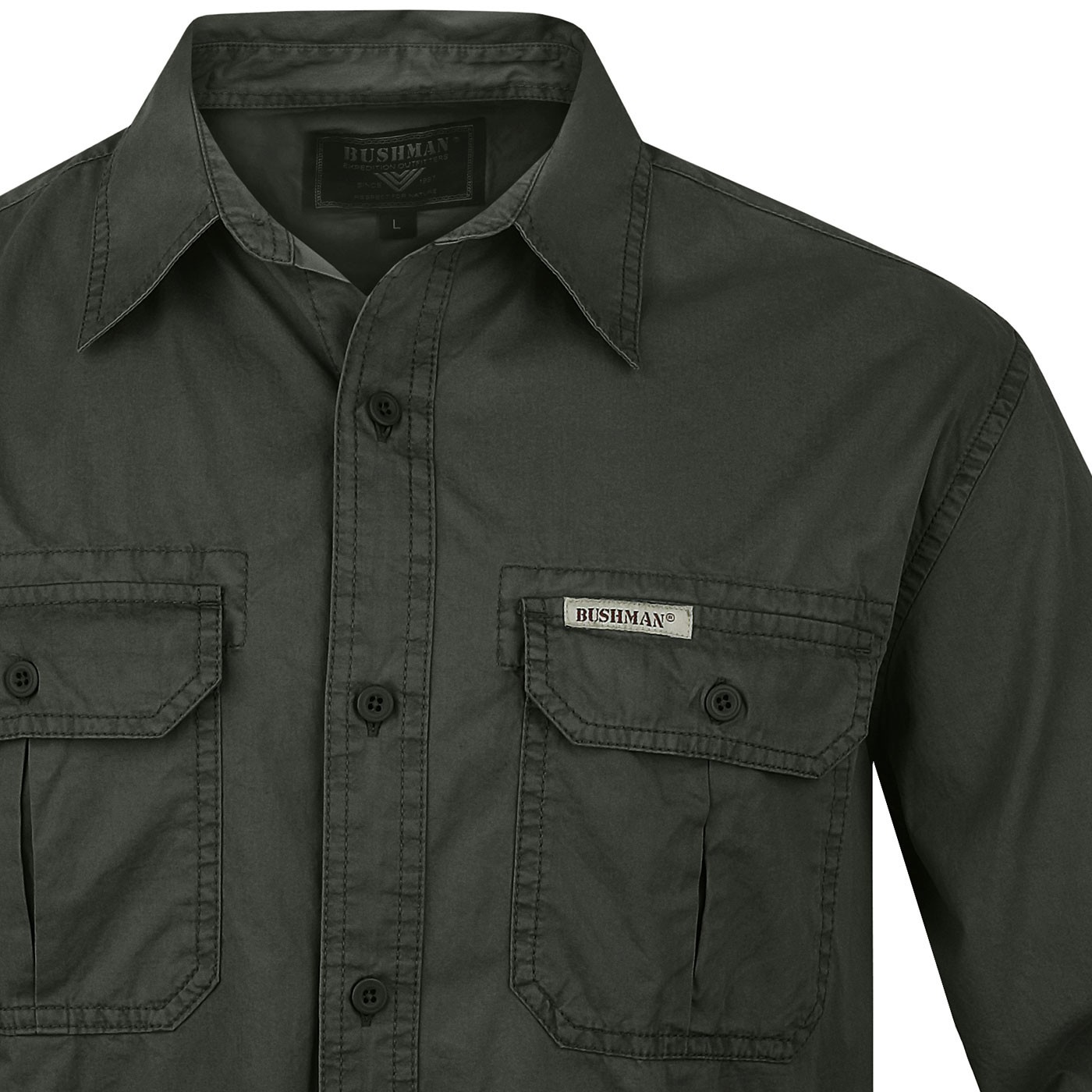 Ďalšími funkčnými a estetickými prvkami sú nakladané náprsné vrecká, do kterých sa vojde viac nevyhnutností než do vreciek klasických, skryté gombíčky k pripnutiu špičiek goliera, putko na chrbte košele a dvojihlou šité švy, ktoré košeľu spevňujú a navyše dobře vyzerajú. Symbol značky BUSHMAN nájdete vyšitý na ľavom rukáve, nenápadné logo na vlajočke v pravom šve a na nášivke nad ľavým vreckom.