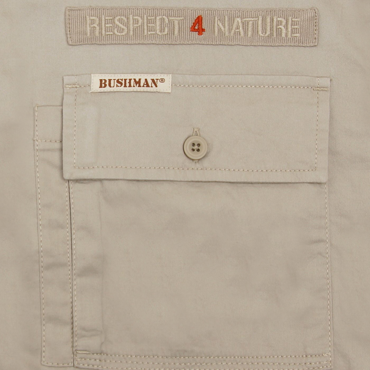 Praktickú aj estetickú rolu plnia dve náprsné vrecká s pätkou. Na ľavom vrecku sa nachádza tkaná etiketa s nápisom BUSHMAN, len o kúsok vyššie vyniká menšia nášivka s mottom značky BUSHMAN: RESPECT 4 NATURE. Obrázok s vlajkovým logom značky je našitý tiež na ľavom rukáve.