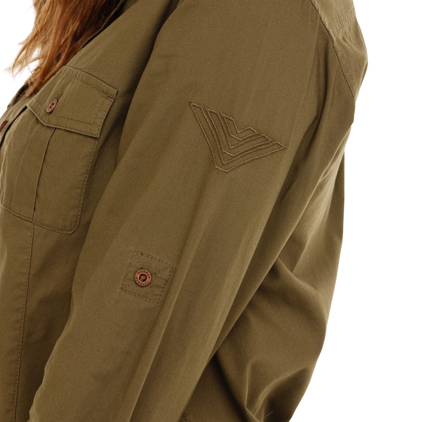 Náprsné vrecká, brandovo zdobené gombíky a jemná brandová výšivka na ľavom rukáve pridávajú kúsku charakter a autentický bushmanský nádych.