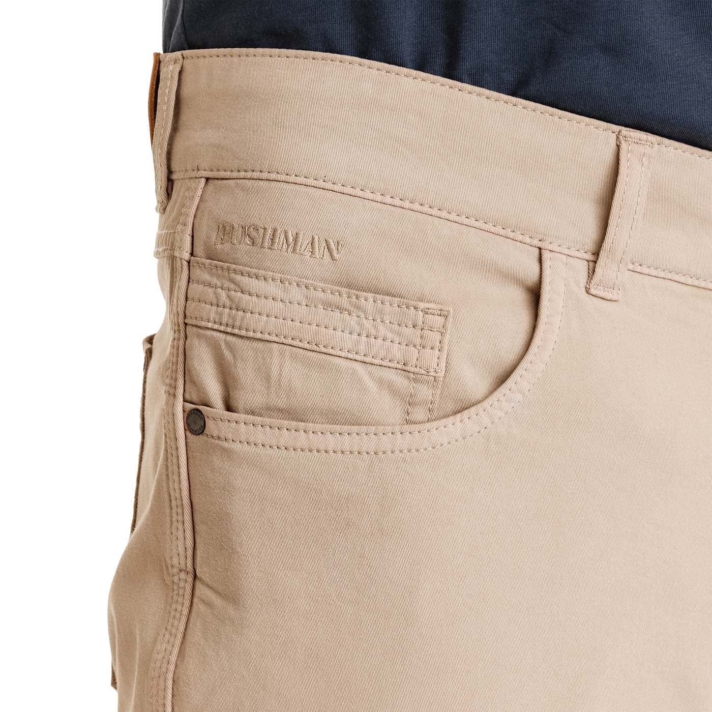 Drobné brandové detaily ako výšivka pri vrecku na mince, kožená nášivka v páse či brandový gombík nenápadne pripomínajú bushmanský rukopis.