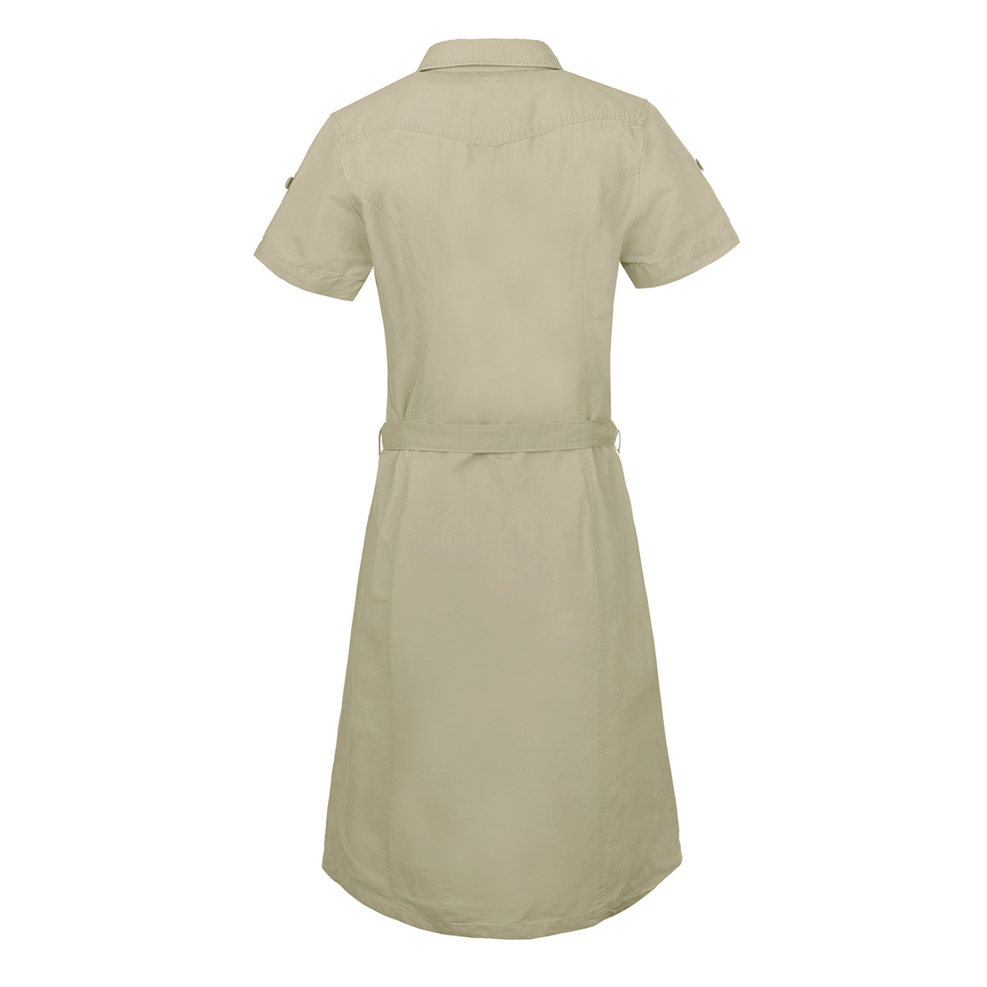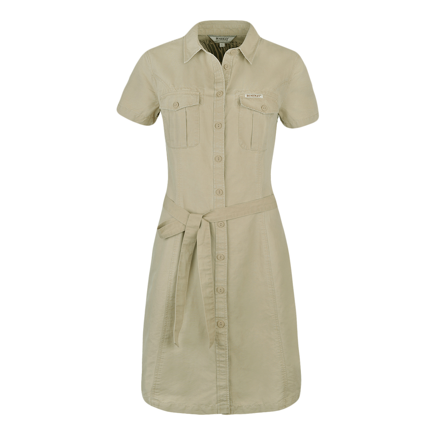 Šaty majú mnoho chytrých „vychytávok“, kvôli ktorým si ich zamilujete. Členiace švy opticky zoštíhľujú a robia z predu aj zo zadu peknú ženskú siluetu. Pás zdůrazníte textilným pásikom. Krátke rukávy sa dajú ešte viac skrátiť a zafixovať páskami. Okrem dvoch vreciek krytých pätkami a zapínacích na gombíky majú šaty ešte dve skryté vrecká v bočnom šve. Milým ostatným „neviditeľným“ detailom je safari potlač na vnútornom sedle. Výšivku loga BUSHMAN nájdete na zadnom diele a vlajočku BUSHMAN v bočnom šve.