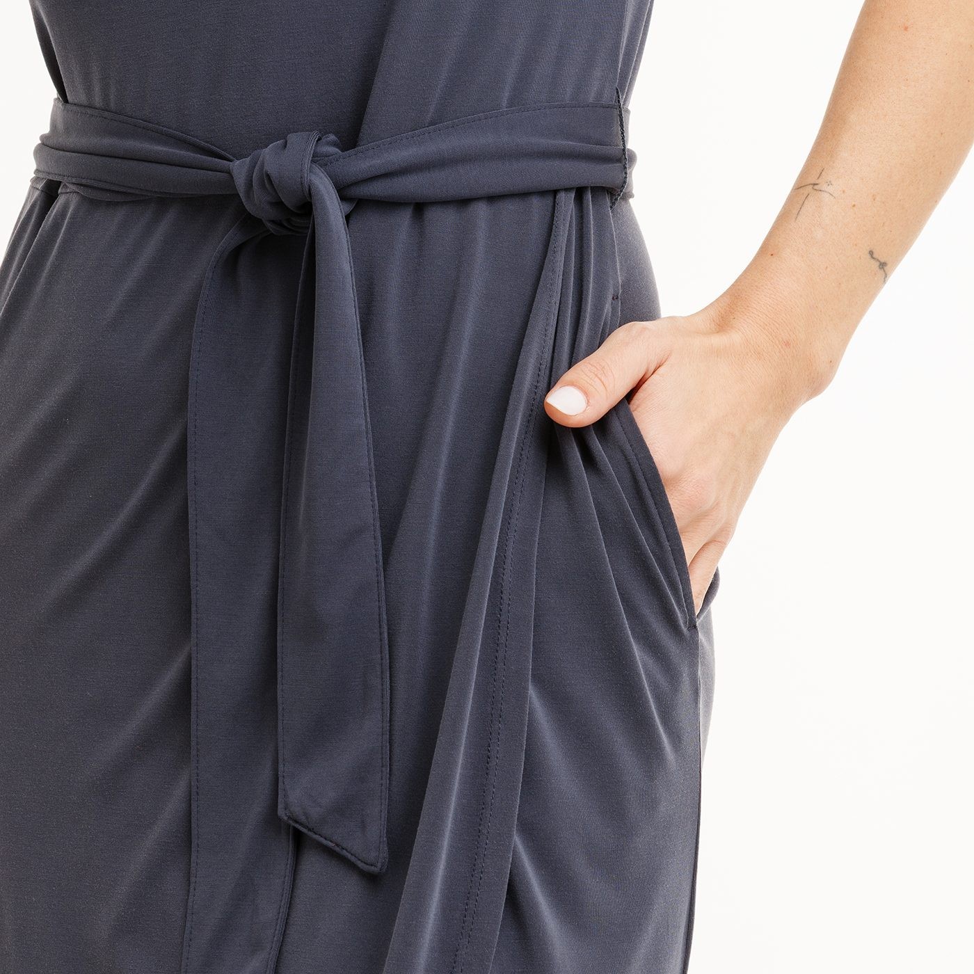 Dámske šaty z modalu s prímesou nylonu a elastanu s efektom „cupro touch“, ktorý im dodáva luxusnú hladkosť. Elegantný lodičkový výstrih a spadnutý rukáv zaisťujú pohodlie. Zavinovací efekt na prednom diele (širší látkový pásik je možné prevliecť pútkami v páse) jemne zdôrazní siluetu. Drobný semišový label na spodnom leme.