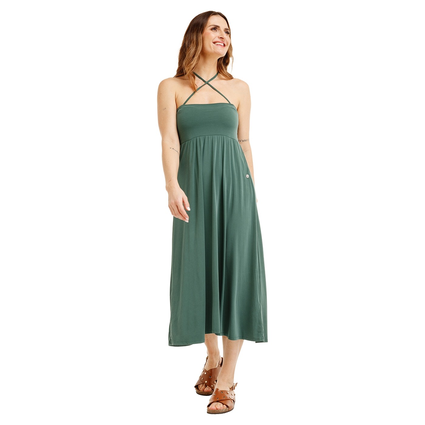 AWKA II je ľahká a splývavá dámska sukňa z modalu s prímesou nylonu a elastanu. Široký pásový golier je možné vyhrnúť, bočné vrecká sú vsadené do švu. Vnútorné pútka a šnúrka s ozdobným kovovým zakončením umožňujú (pri použití ako ramienok) variabilné nosenie sukne ako šiat.Kovový brandový label pod ľavým vreckom.