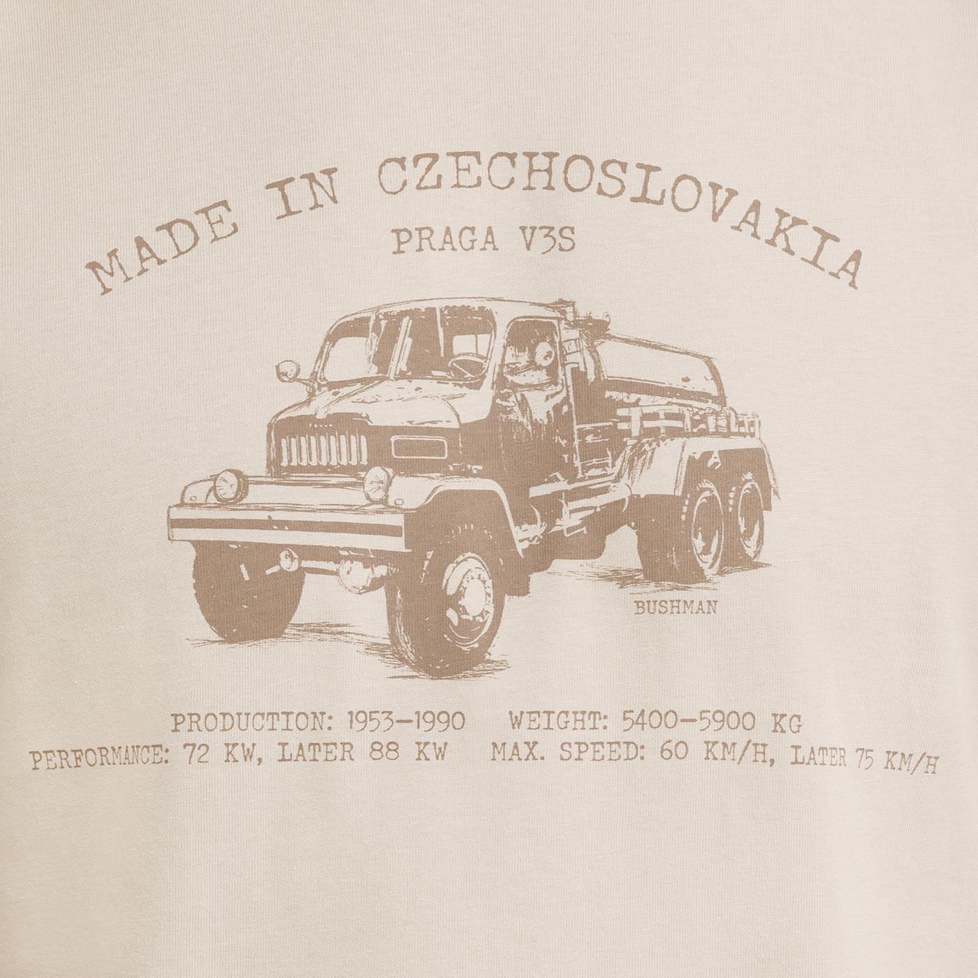 „BOBSTOCK“ potlač Made in Czechoslovakia dopĺňa motív legendárneho vozidla V3S, symbolu poctivého strojárstva a nezdolnosti. Táto klasika sa neobťažuje vysvetľovaním - kto vie, ten vie. Potlač je poctou československej technike, ktorá si vydobyla rešpekt doma aj vo svete.