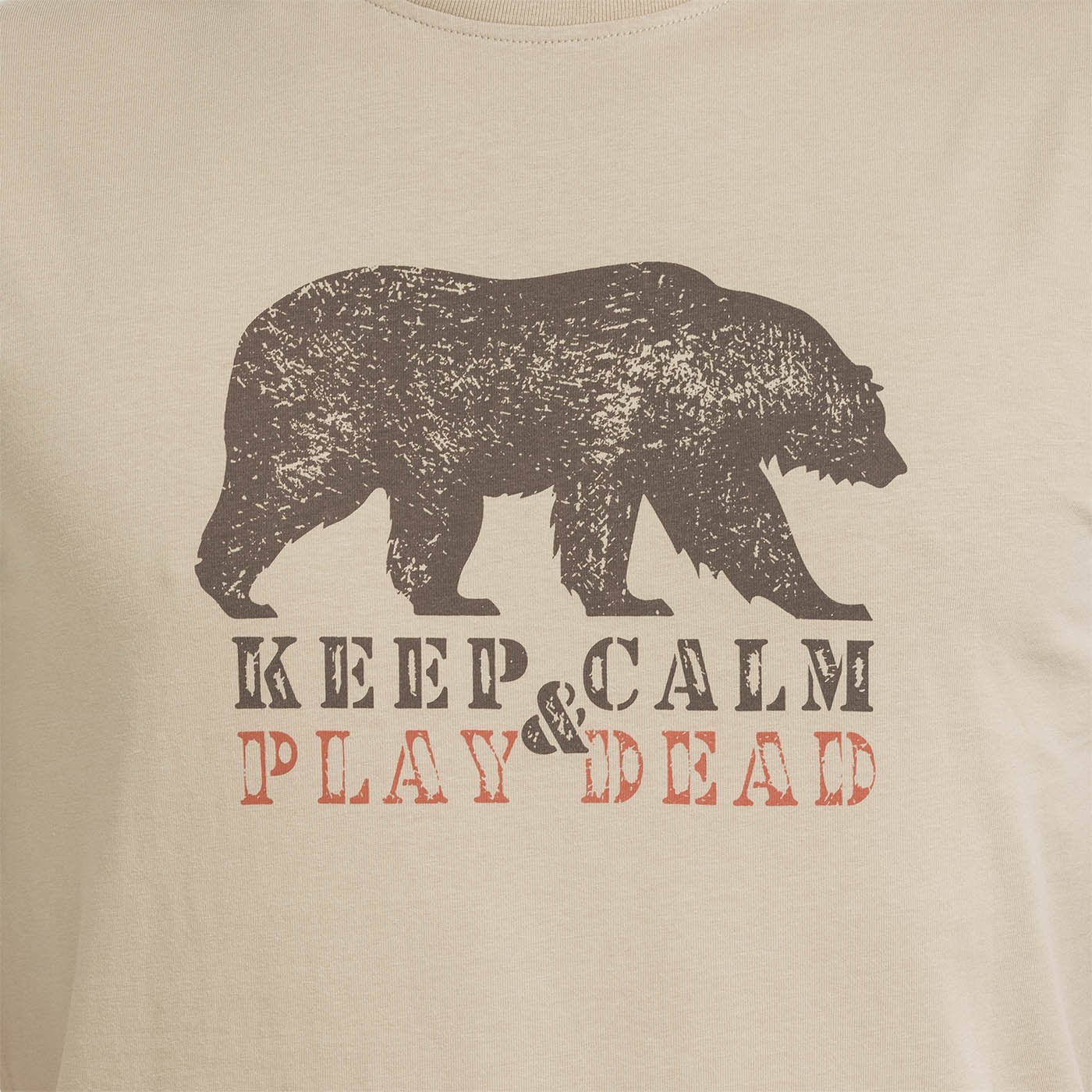 Keď sa situácia vyhrotí, zachovaj pokoj… a hraj mŕtveho. Vtipná potlač – obrázok medveďa s nápisom „Keep calm and play dead“ – jasne vyjadrí tvoj postoj. Tričko zo 100% bavlny, základného rovného strihu, ti zaistí pohodlie aj v tých dňoch, kedy chceš hlavne splynúť… a hrať mŕtveho. Zmäkčené praním.