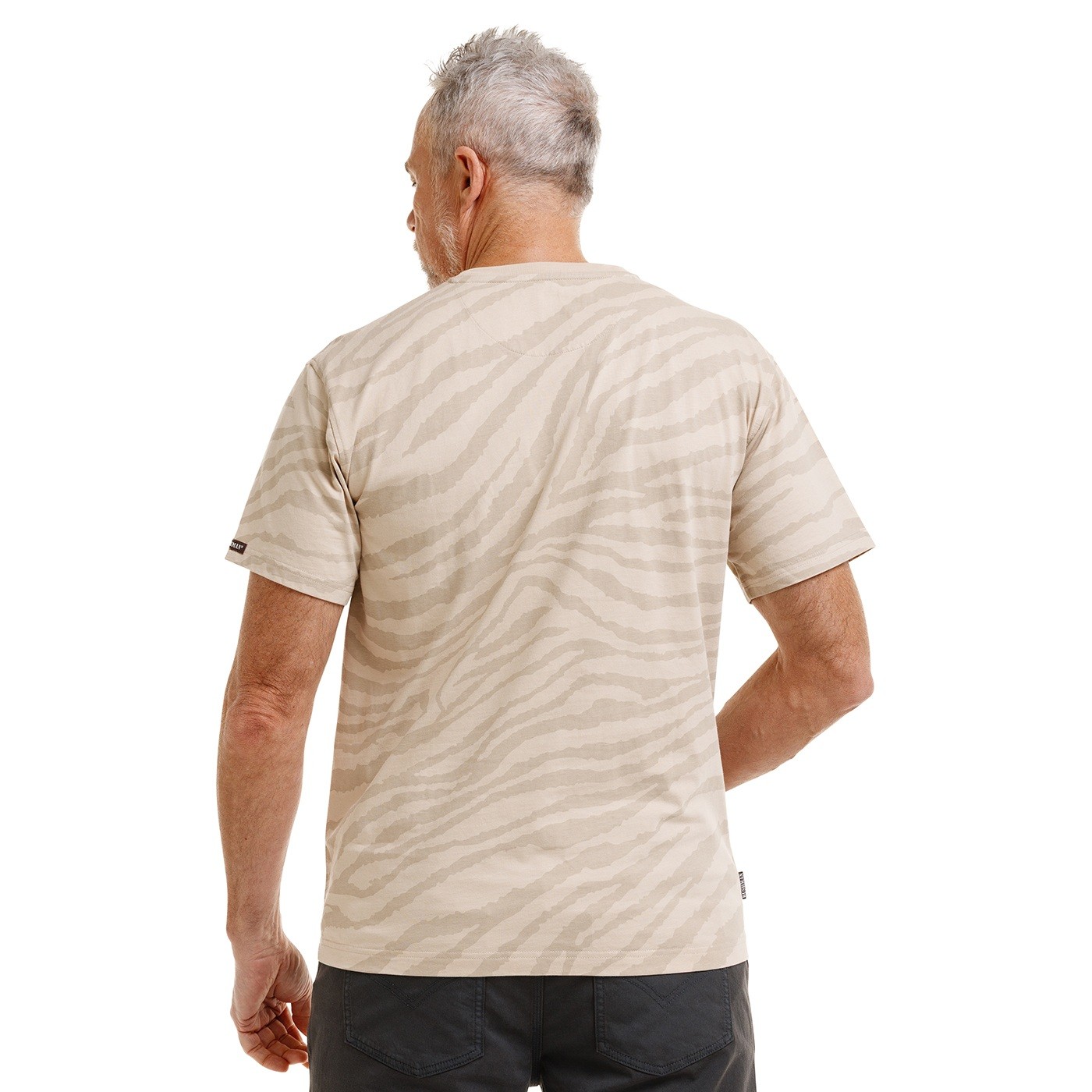 DIGRE je výrazné pánske tričko s celopotlačou inšpirovaným zebrím motívom spájajúce pohodlie s hravým bushmanským štýlom. Bavlnená jednolícna pletenina je pevná a príjemná na nosenie, rovný strih a okrúhly výstrih poskytujú komfort po celý deň. Tkaná brandová nášivka na ľavom rukáve dodáva tričku autentický charakter.