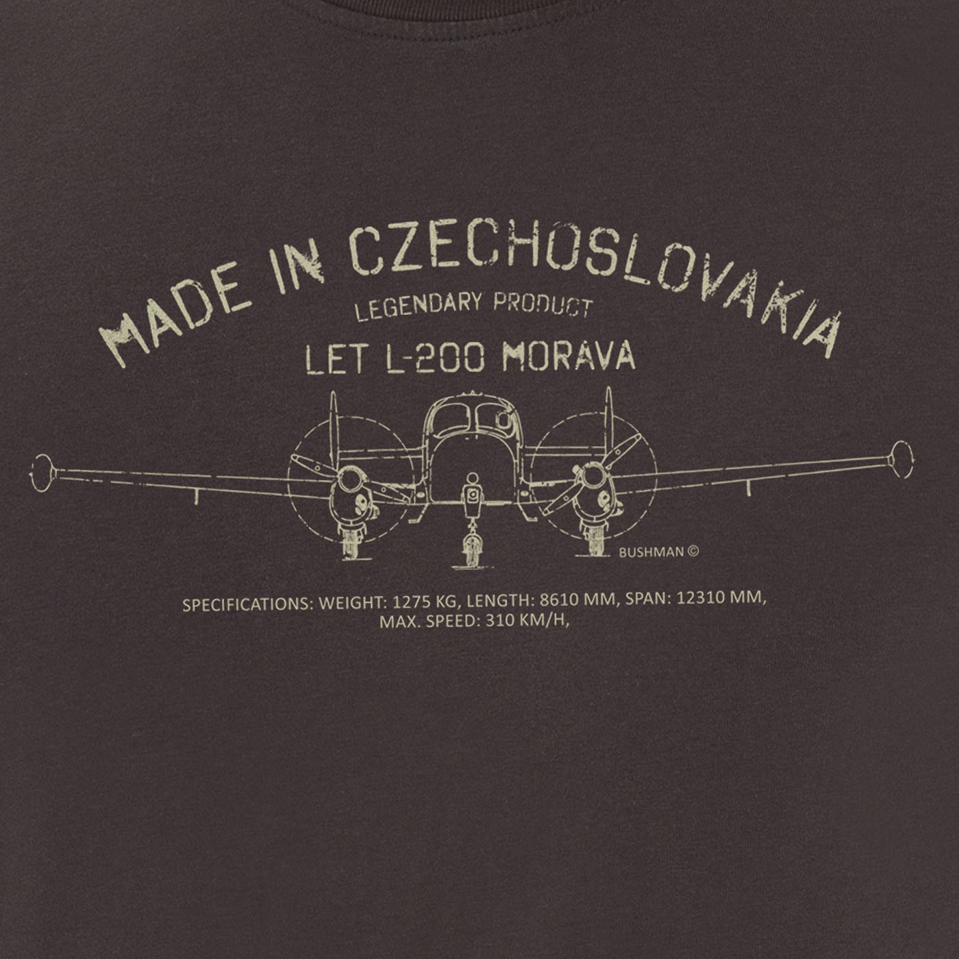 Vážime si veci, ktoré dobyli svet alebo srdce minulých generácií. Mal sa stať novým aerotaxíkom a jeho vývoj začal v budúcom Lete Kunovice v roku 1955. Dvojmotorový samonosný dolnoplošník Let L-200 Morava pre pilota a troch až štyroch cestujúcich je pre svoju obľúbenosť a kvalitu v súčasnosti využívaný najmä na vyhliadkové lety. Špeciálnou edíciou potlačí na týchto bavlnených tričkách s krátkym rukávom vzdáva BUSHMAN hold legendárnym produktom "made in Czechoslovakia". 100% bavlna, 180 g/m2, rovný strih.
