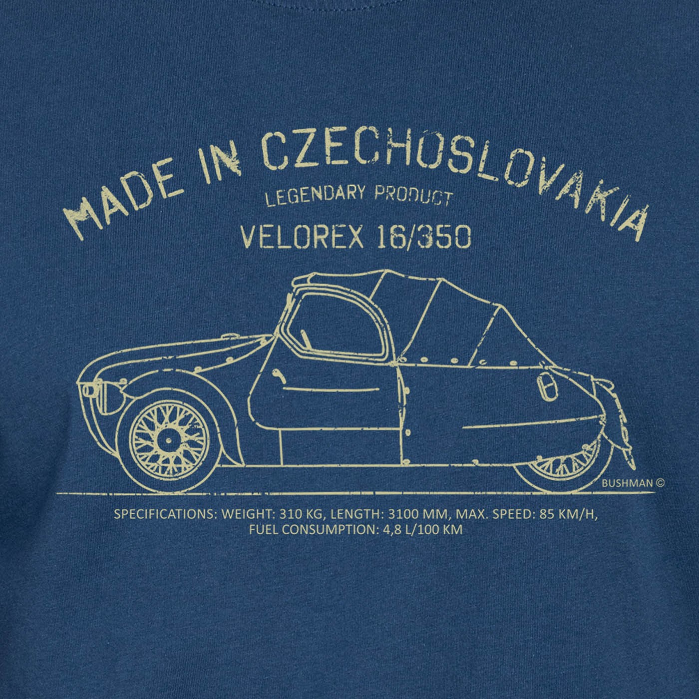 Vážime si veci, ktoré dobyli svet alebo srdce minulých generácií. Velorex, prezývaný hadrák, handraplán, husacie stehno, montgomerák, netopier, splašené rúrky či utekajúci stan, sa stal jediným homologovaným vozidlom s plátennou karosériou na svete. Pôvodne malosériový trubkový rám potiahnutý koženkou konštruktérov Františka a Mojmíra Stránskych sa vyrábal vo velodružstve Solnice ako vozítko pre invalidov a preslávil sa vo filme Vrchní prchni. Špeciálnou edíciou potlačí na týchto bavlnených tričkách s krátkym rukávom vzdáva BUSHMAN hold legendárnym produktom "made in Czechoslovakia". 100% bavlna, 180 g/m2, rovný strih.