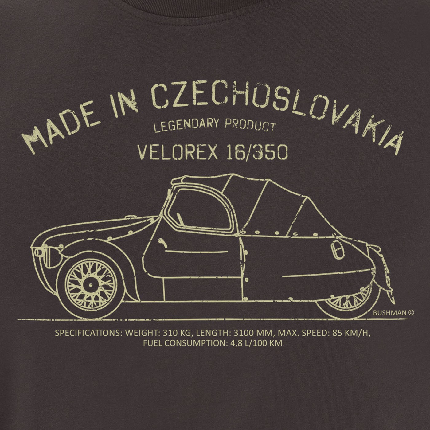 Vážime si veci, ktoré dobyli svet alebo srdce minulých generácií. Velorex, prezývaný hadrák, handraplán, husacie stehno, montgomerák, netopier, splašené rúrky či utekajúci stan, sa stal jediným homologovaným vozidlom s plátennou karosériou na svete. Pôvodne malosériový trubkový rám potiahnutý koženkou konštruktérov Františka a Mojmíra Stránskych sa vyrábal vo velodružstve Solnice ako vozítko pre invalidov a preslávil sa vo filme Vrchní prchni. Špeciálnou edíciou potlačí na týchto bavlnených tričkách s krátkym rukávom vzdáva BUSHMAN hold legendárnym produktom "made in Czechoslovakia". 100% bavlna, 180 g/m2, rovný strih.