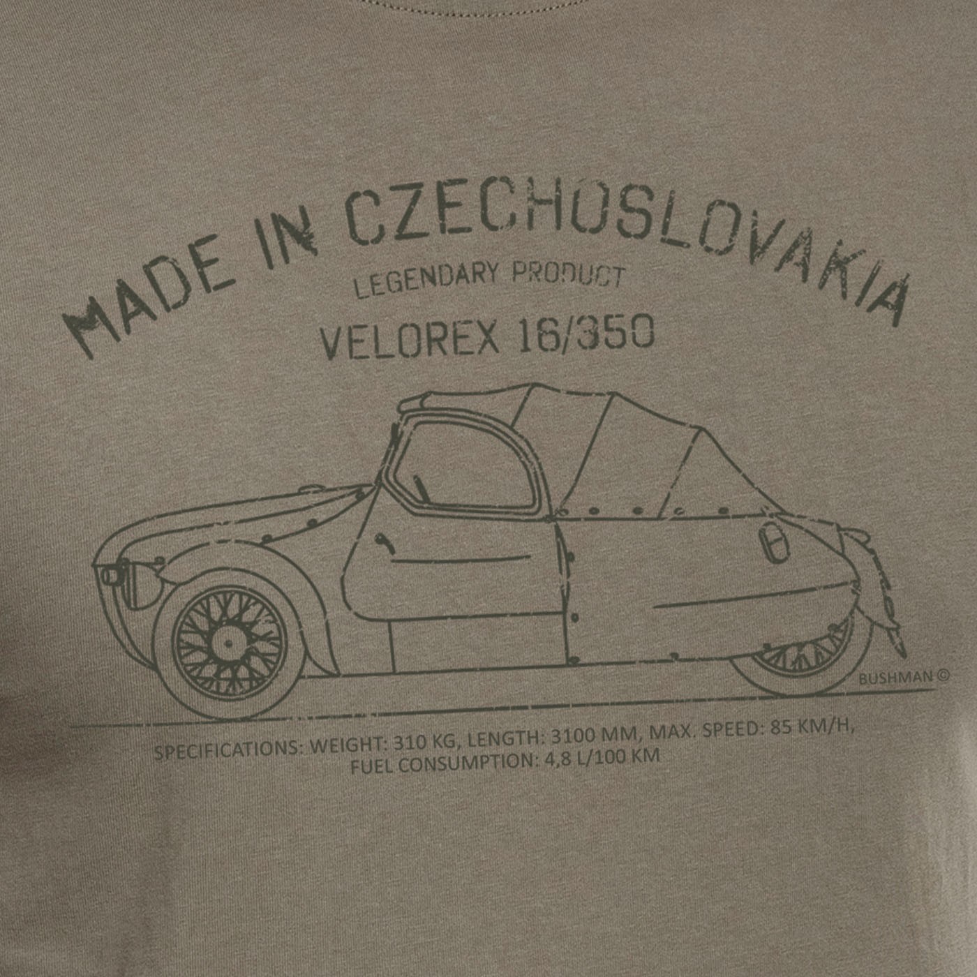 Vážime si veci, ktoré dobyli svet alebo srdce minulých generácií. Velorex, prezývaný hadrák, handraplán, husacie stehno, montgomerák, netopier, splašené rúrky či utekajúci stan, sa stal jediným homologovaným vozidlom s plátennou karosériou na svete. Pôvodne malosériový trubkový rám potiahnutý koženkou konštruktérov Františka a Mojmíra Stránskych sa vyrábal vo velodružstve Solnice ako vozítko pre invalidov a preslávil sa vo filme Vrchní prchni. Špeciálnou edíciou potlačí na týchto bavlnených tričkách s krátkym rukávom vzdáva BUSHMAN hold legendárnym produktom "made in Czechoslovakia". 100% bavlna, 180 g/m2, rovný strih.